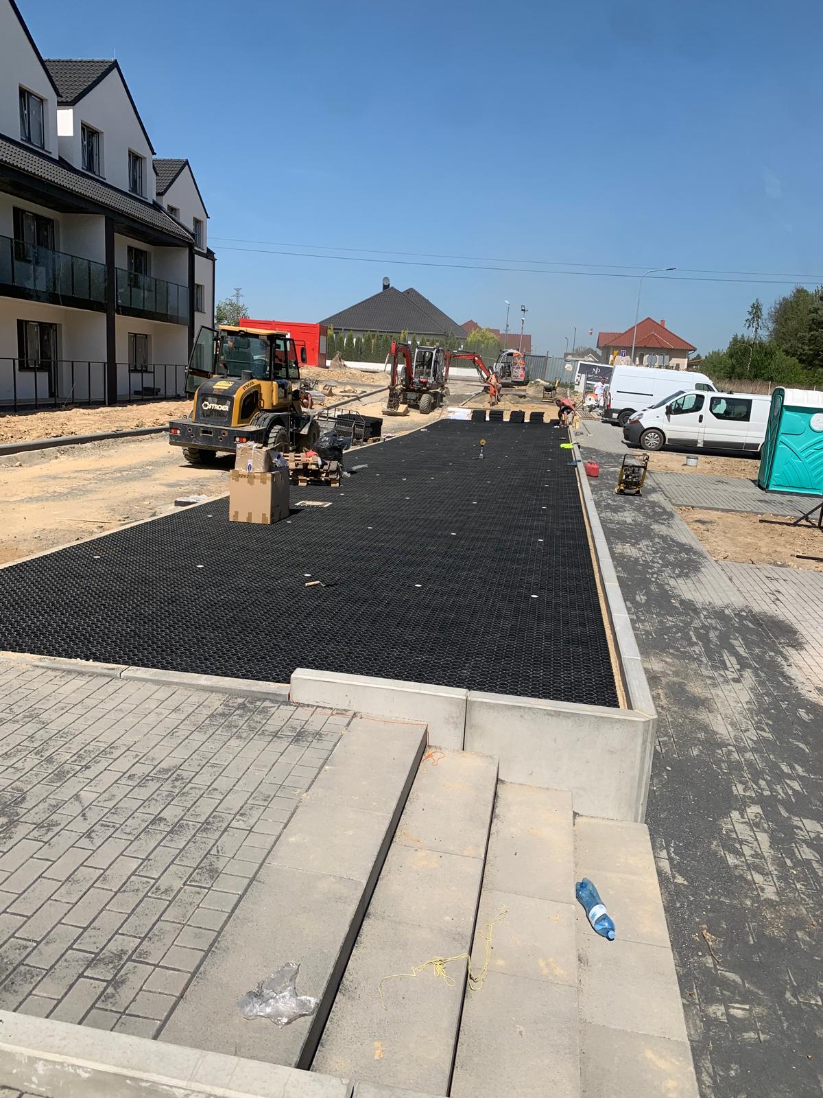 Wykopy pod fundamenty, drogi i parkingi. Niwelacja terenu, skarpowanie, wywóz ziemi. Badania zagęszczenia gruntu i kontrola jakości podbudowy.